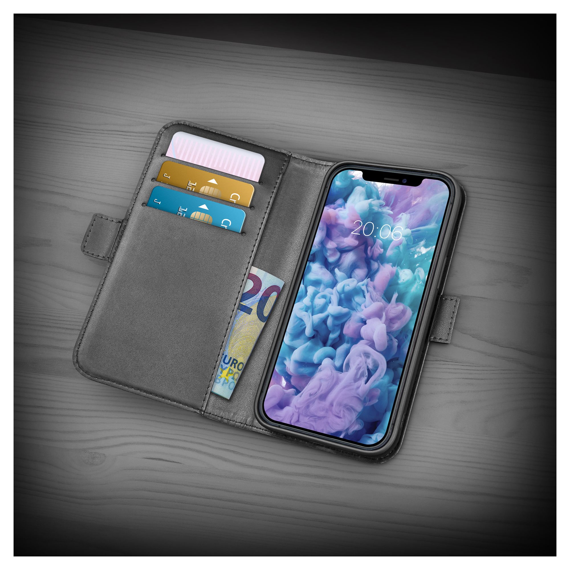 Elegantan kožni dizajn koji podseća na novčanik zahvaljujući ugrađenim pregradama za kartice i jednom velikom džepu za novčanice.