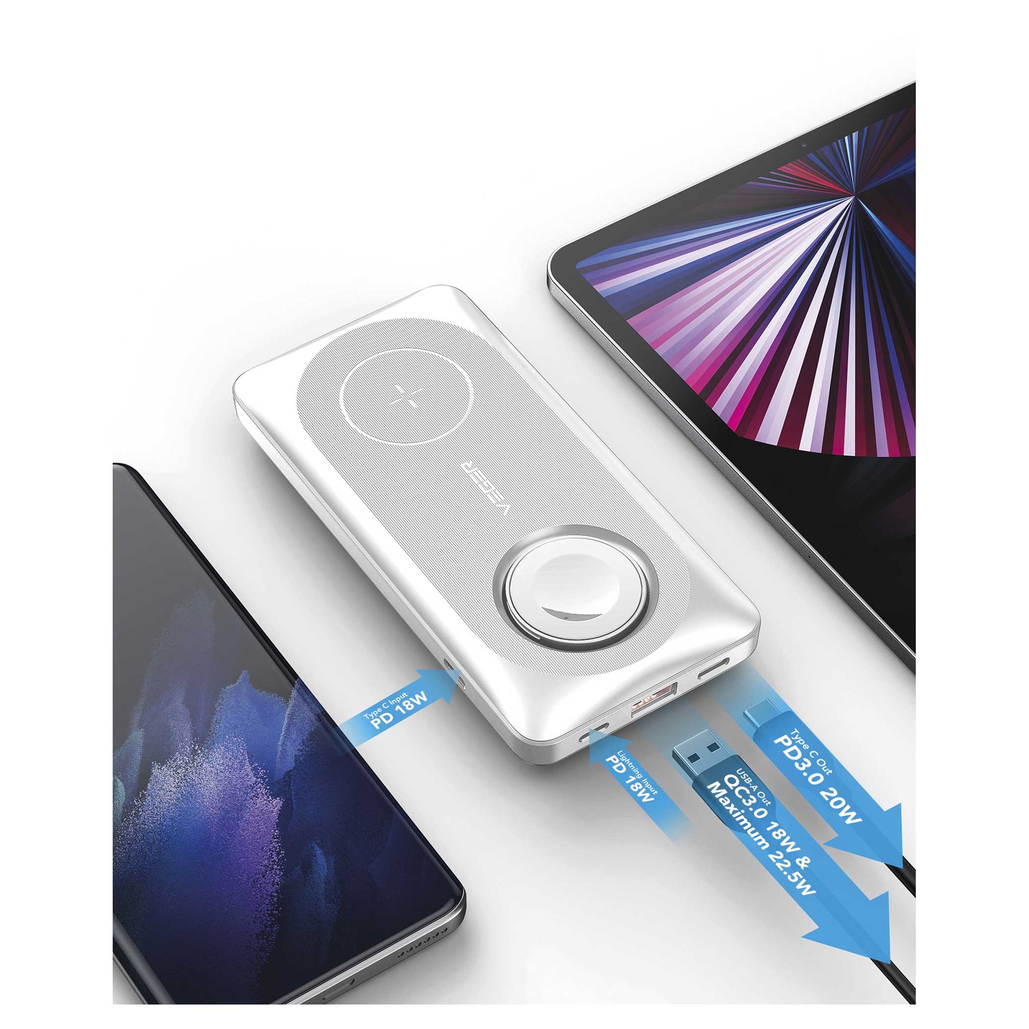 Na IENKEE IPB 510 3 u 1 pover banku možete da povežete do 3 različita uređaja odjednom i uštedite vreme. Maksimalna snaga punjenja je do 22,5 V za USB-A, 7,5 V za tip C, 2,5 V za punjač za Apple Vatch koji se okreće i 15 V za bežično punjenje sa MagSafe tehnologijom. Može da centrira telefon u sredini radi veće efikasnosti punjenja. Pametni čip procenjuje idealnu izlaznu snagu i obezbeđuje da nema preopterećenja.