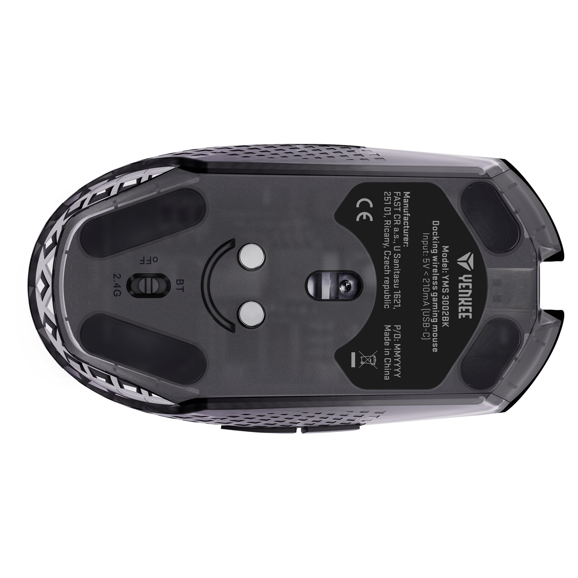 Integrisana YMS 3002BK baterija miša ima kapacitet od 500 mAh i životni vek od oko 50 radnih sati. Samo ga stavite na magnetnu priključnu stanicu nakon upotrebe za punjenje koje je brže nego sa konvencionalnim kablom. Stanica se može koristiti i kao predajnik na 2,4 GHz, sa odvojivom podlogom na dnu koja se može pričvrstiti na radnu površinu ili zid. Tako možete pričvrstiti priključnu stanicu na idealno mesto i ponovo odvojiti ako je potrebno. Ako želite da koristite miš na terenu, ne morate da nosite stanicu sa sobom. Takođe možete da koristite USB-C kabl za punjenje i klasični Bluetooth za uparivanje.