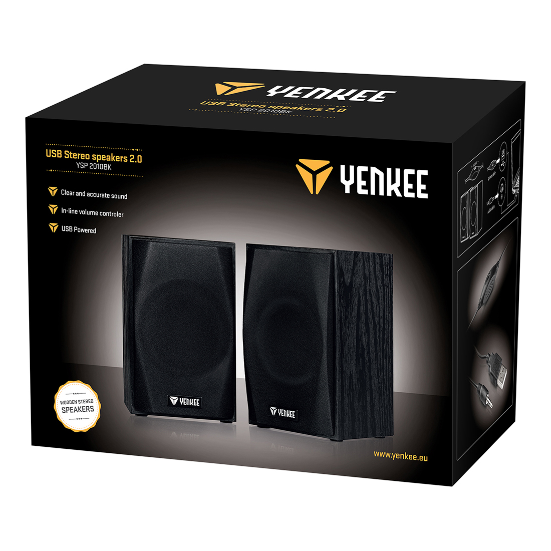 Drveni stereo zvučnici napajani preko USB-a, čistog i preciznog zvuka, poboljšavaju reprodukciju zvuka preko računara. Signal se prenosi putem standardnog stereo konektora od 3,5 mm.
